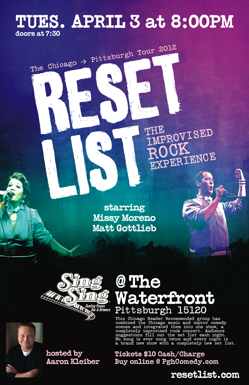 On Tuesday, April 3rd 2012 Reset List is descending upon the great city of Pittsburgh to shake its steel foundations with rock and roll.  We take the stage at the Sing Sing Dueling Piano Bar at 8p.m. for an evening of high expectations and lowered inhibitions.  Stand-up comedian Aaron Kleiber opens the evening.  Aaron has opened for the likes of Sinbad, Bobcat Goldthwait and Steve-O from Jackass and we are stoked to share a stage with him.