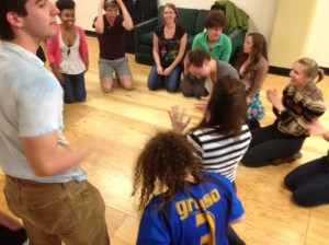 The real reason, or rather, the other reason we were at Point Park was because we were invited to teach an improv workshop to the theatre students currently studying there.  On a Monday afternoon we had 19 students, 1 observer and 3 teachers at our workshop.  The students had varying levels of improv experience but they were all fearless and jumped right into the exercizes we brought to the table.  They yes/anded, heightened emotions and stole focus like pros.  When we reached the musical improv portion of the workshop the students caught on quickly and really shined.  The workshop concluded with the students singing a group number from Hunger Games Zombies (the musical) titled “Love at First Bite.”   It (and they) rocked.