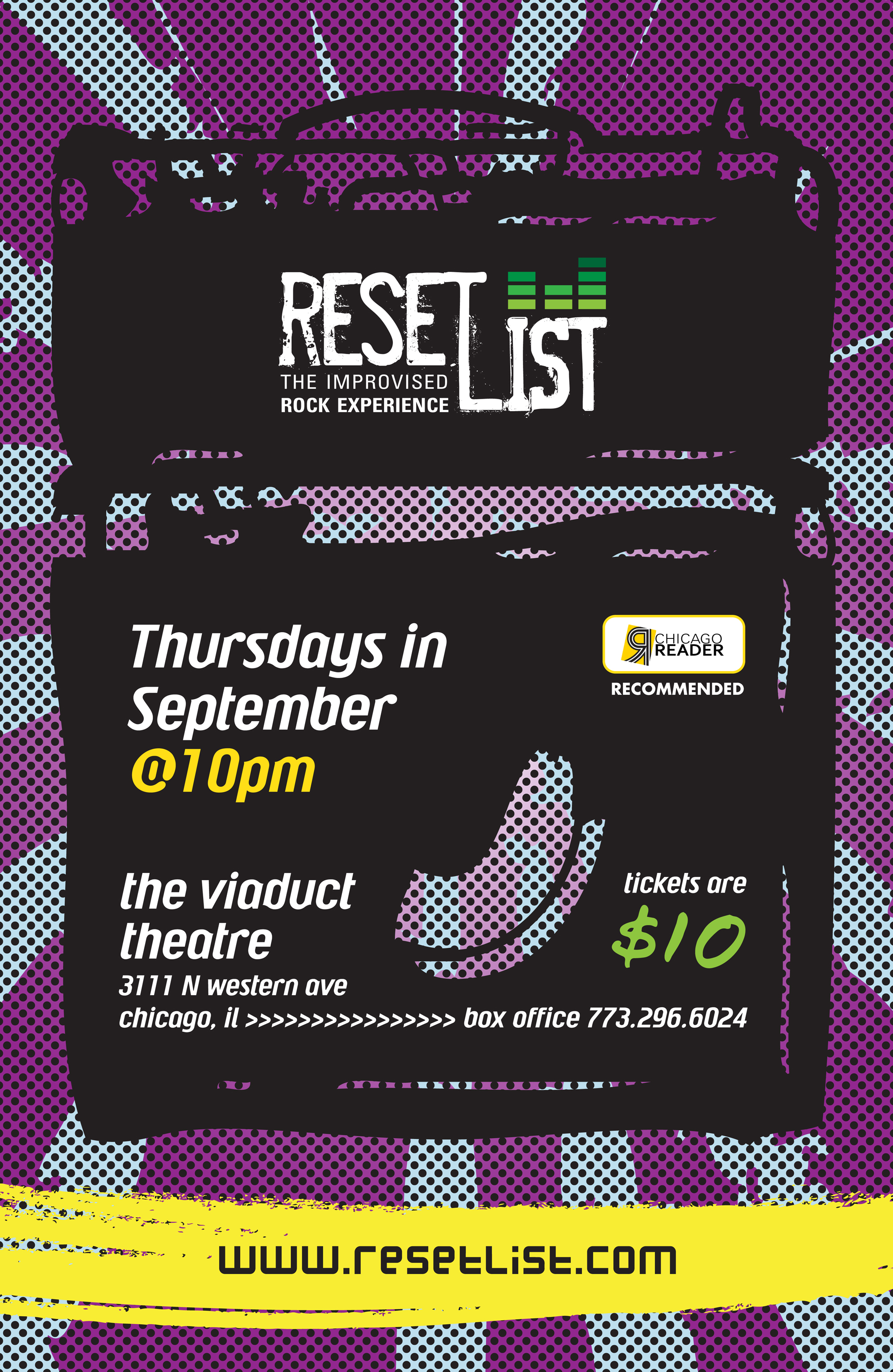 Hear ye hear ye.  Every Thursday in September Reset List is returning to the Viaduct Theater to make sweet, sweaty rock & roll for the masses.  We’ve got new members, new licks, new outfits and a new show every night.  Bring a change of underwear because we’re singing all the songs you never knew you loved, and we’re only playing the songs that you request.  We won’t divulge which bodily fluid will cause you to change your underwear, but you’ve got at least 5 to choose from.